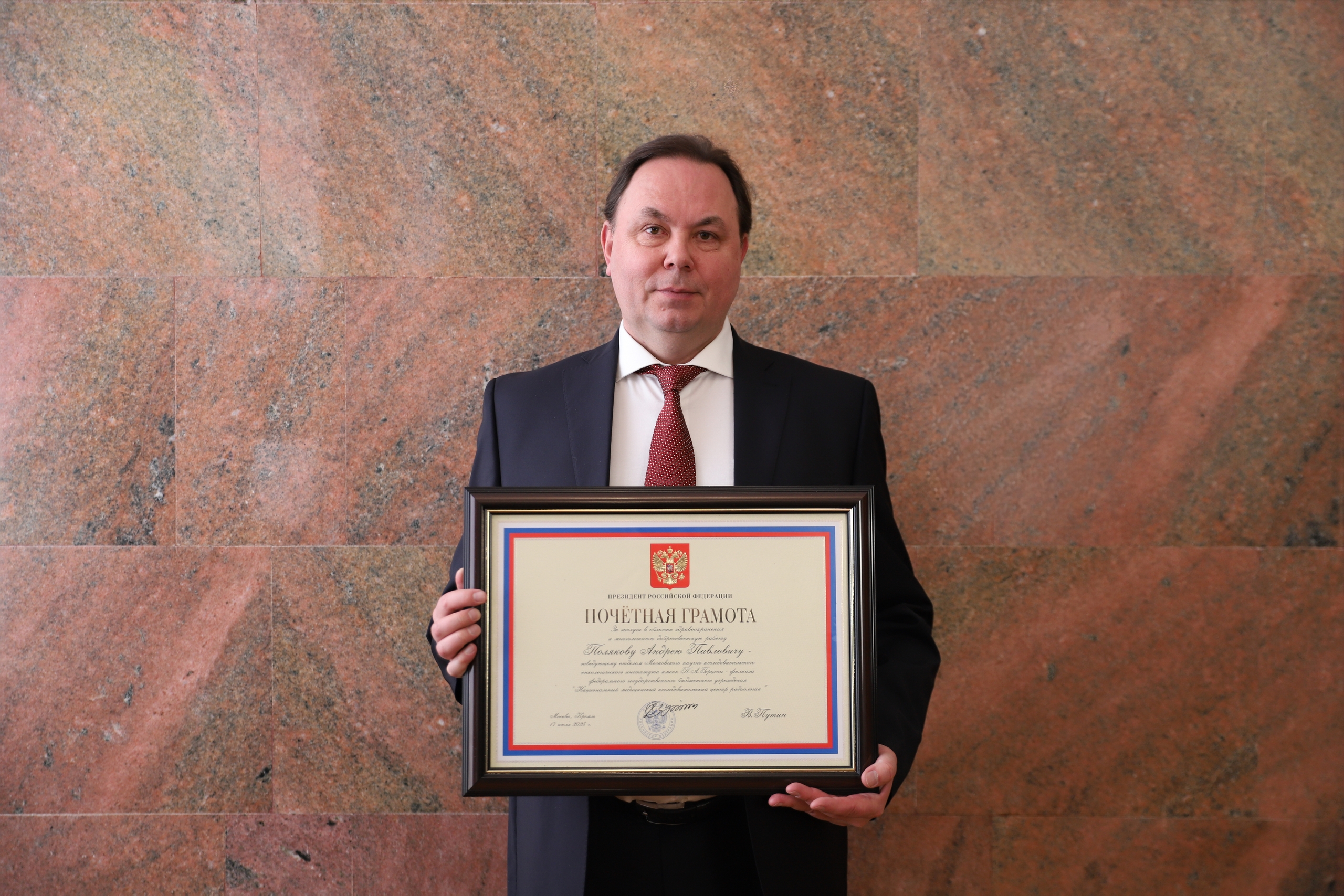Почетной грамотой Президента Российской Федерации отмечен Поляков Андрей Павлович, заведующий отделом опухолей головы, шеи и микрохирургии МНИОИ им. П.А. Герцена.