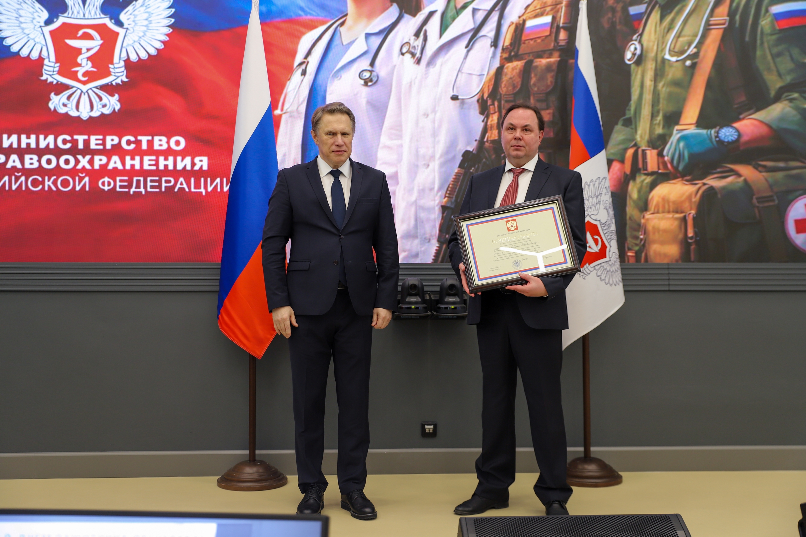 В ходе церемонии Михаил Мурашко подчеркнул, что для медицинских специалистов День защитника Отечества имеет особое значение. В период пандемии COVID-19 врачи работали в «красных зонах», организовывали помощь на дому, обеспечивали бесперебойное лечение пациентов. Сегодня, в условиях новых вызовов, медики продолжают оставаться на передовой, оказывая помощь военнослужащим и гражданскому населению, развивая наставничество и поддерживая устойчивость системы здравоохранения.